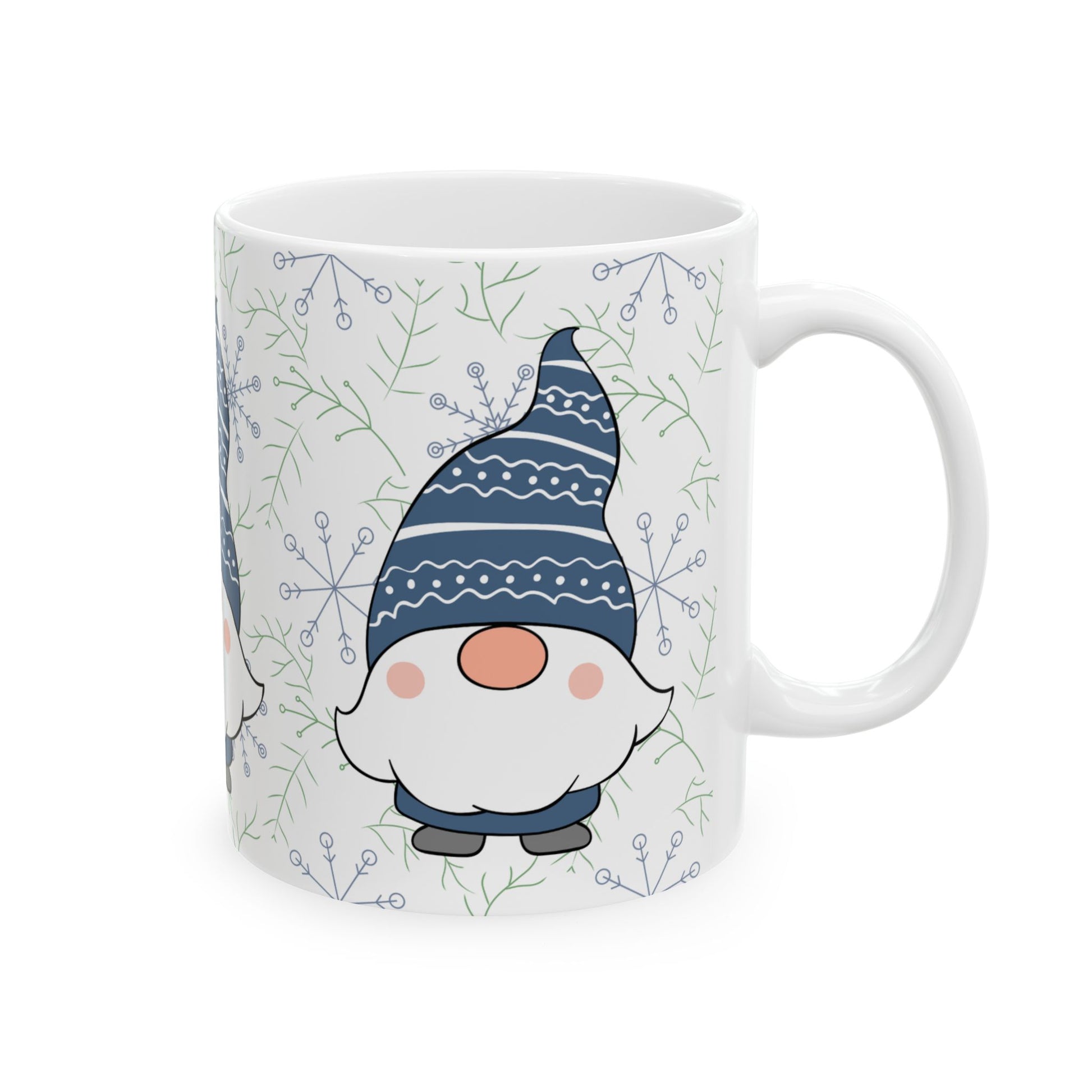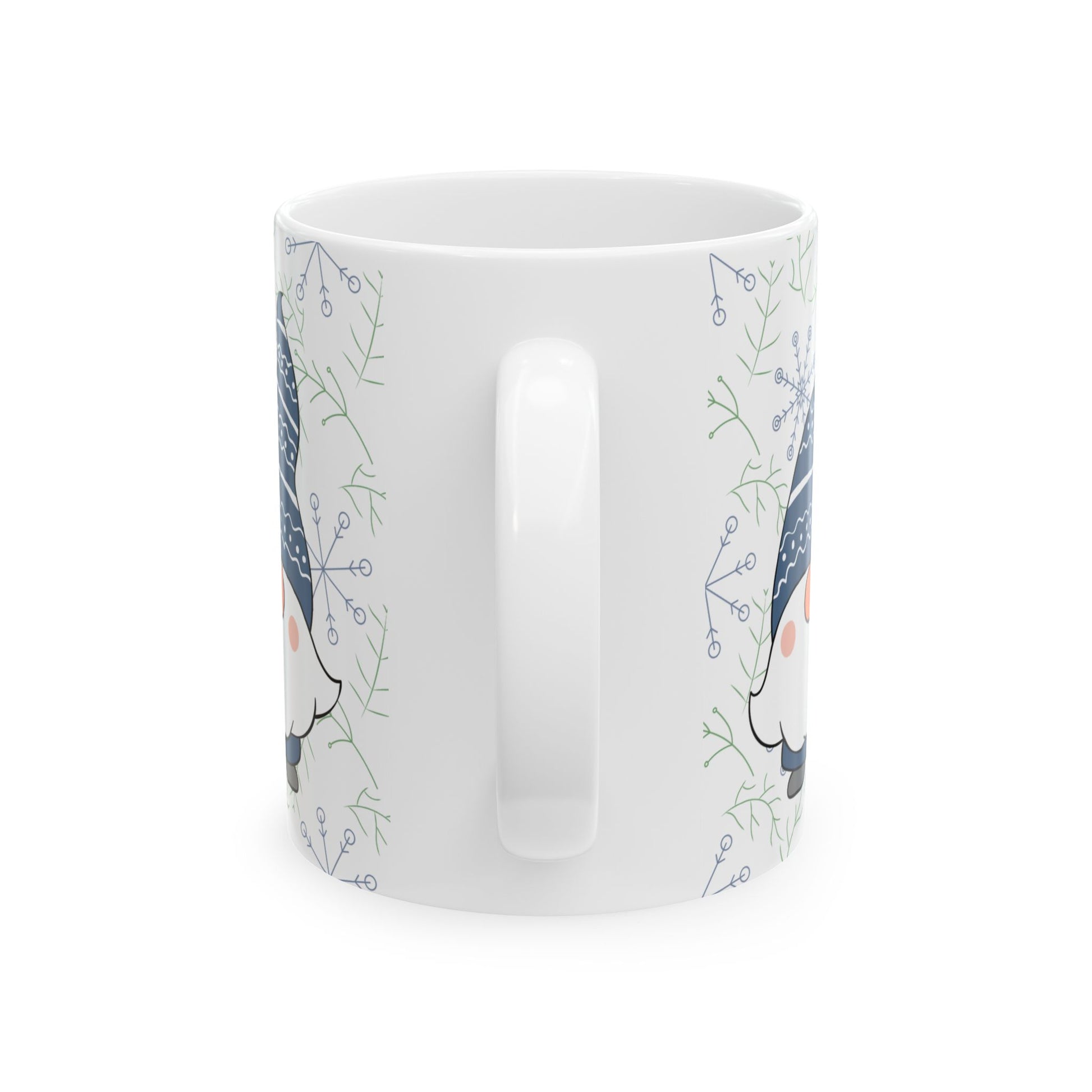 Blue Gnome Winter Mug, Snowflake Ceramic Coffee Cup, Cozy Christmas Gift, 11oz Holiday Gnome Mug