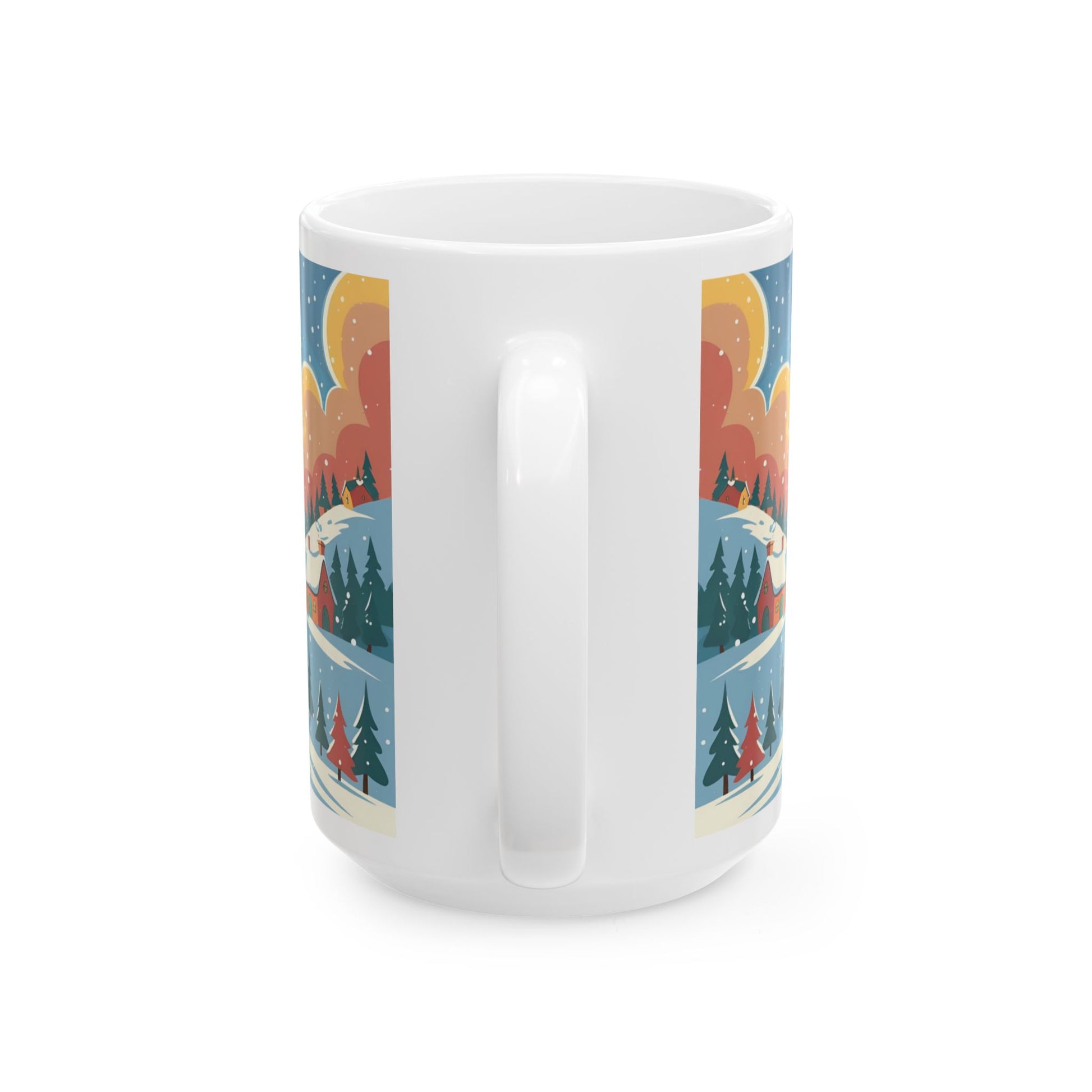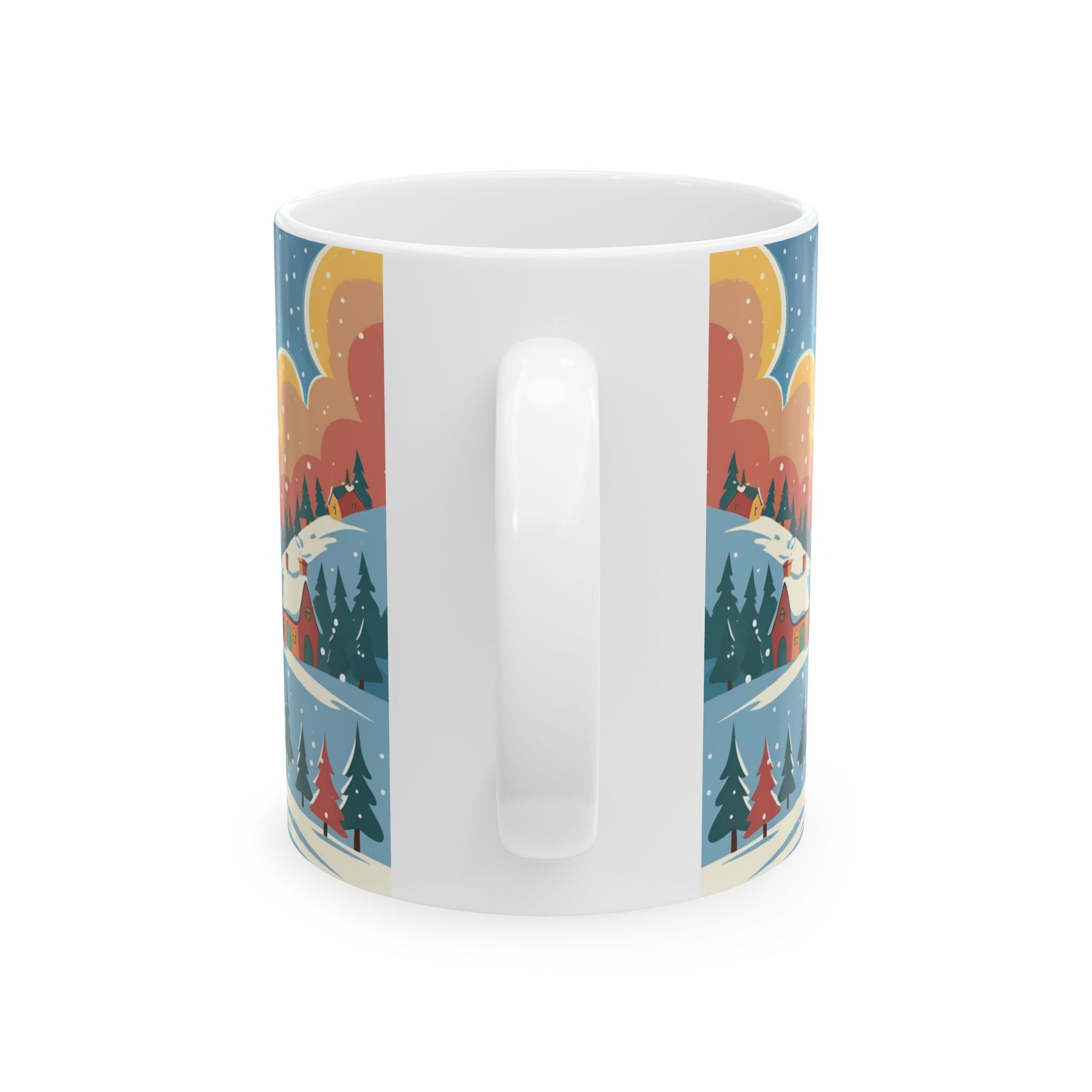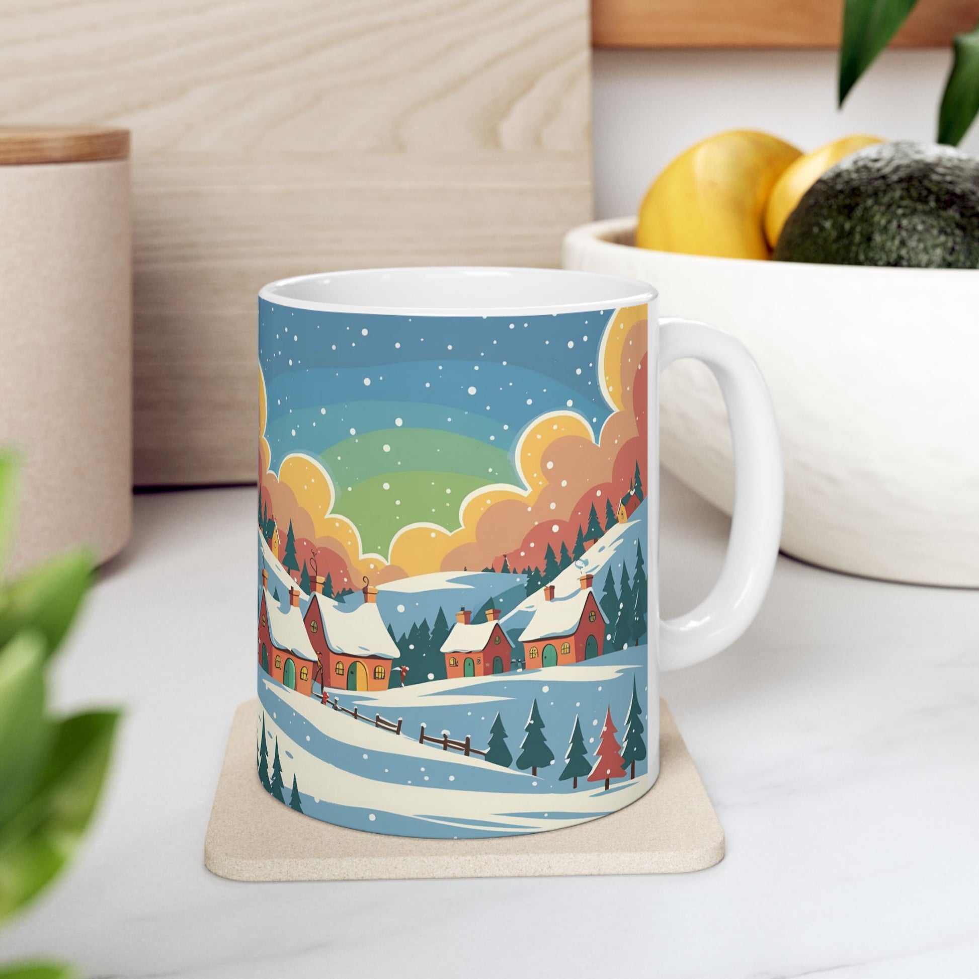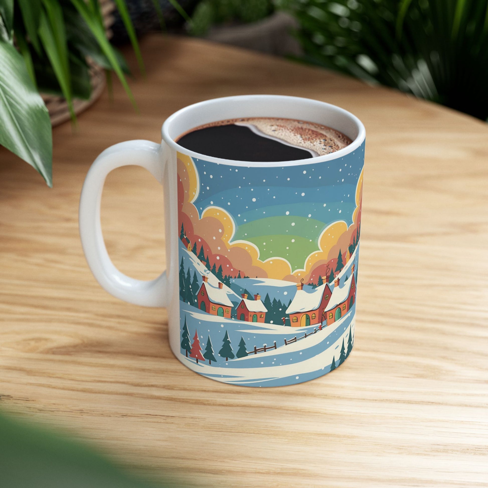 A beautiful winter snow scene ceramic mug featuring a charming town with trees, making it a perfect holiday gift. This mug adds a cozy and festive atmosphere to your morning coffee routine. Ideal for anyone who loves holiday-themed decor and enjoys a warm cup of coffee or tea during the winter season.