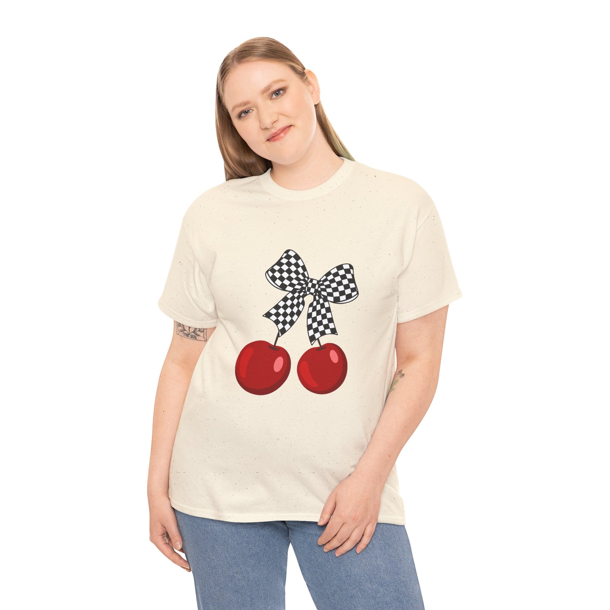 Introducing the perfect blend of comfort and style with this Unisex Heavy Cotton Tee. Its eye-catching design featuring playful red cherries against a classic black and white checkered bow brings a touch of whimsy to your wardrobe. Ideal for casual outings, this shirt can easily transition from day to night, making it a versatile addition to any closet. It's perfect for those who appreciate unique, fun fashion and want to express their individuality. Celebrate summer barbecues, picnics, or casual gatherings with friends in this shirt, and make it a go-to for holidays like Valentine's Day or any cheerful occasion. Designed for adults, it embodies comfort while ensuring you stay trendy and relaxed, no matter the setting.