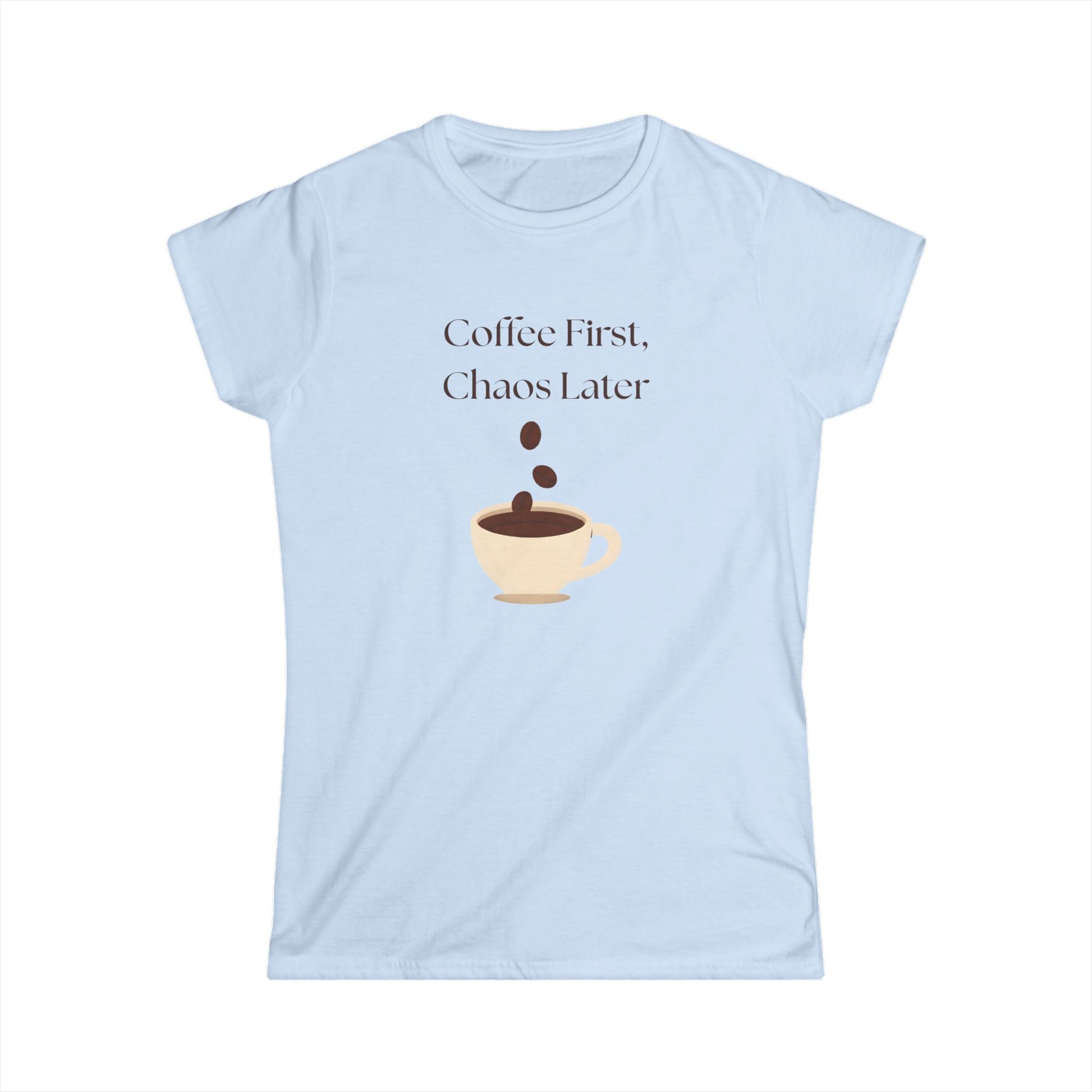 Start your day with sass and a strong cup of coffee in this playful "Coffee First, Chaos Later" Women's Softstyle Tee. Featuring a cute coffee cup graphic and a relatable message, this comfy tee is perfect for every woman whose day doesn’t officially begin until the first sip. Made from soft, breathable 100% ringspun cotton, it’s lightweight, semi-fitted, and effortlessly stylish—ideal for everything from lounging at home to conquering chaotic to-do lists. Whether you’re treating yourself or surprising your favorite coffee-loving friend, this tee makes a fun and thoughtful gift for birthdays, holidays, or even National Coffee Day. Easy to pair with jeans, joggers, or leggings, it’s a must-have for caffeine queens everywhere!