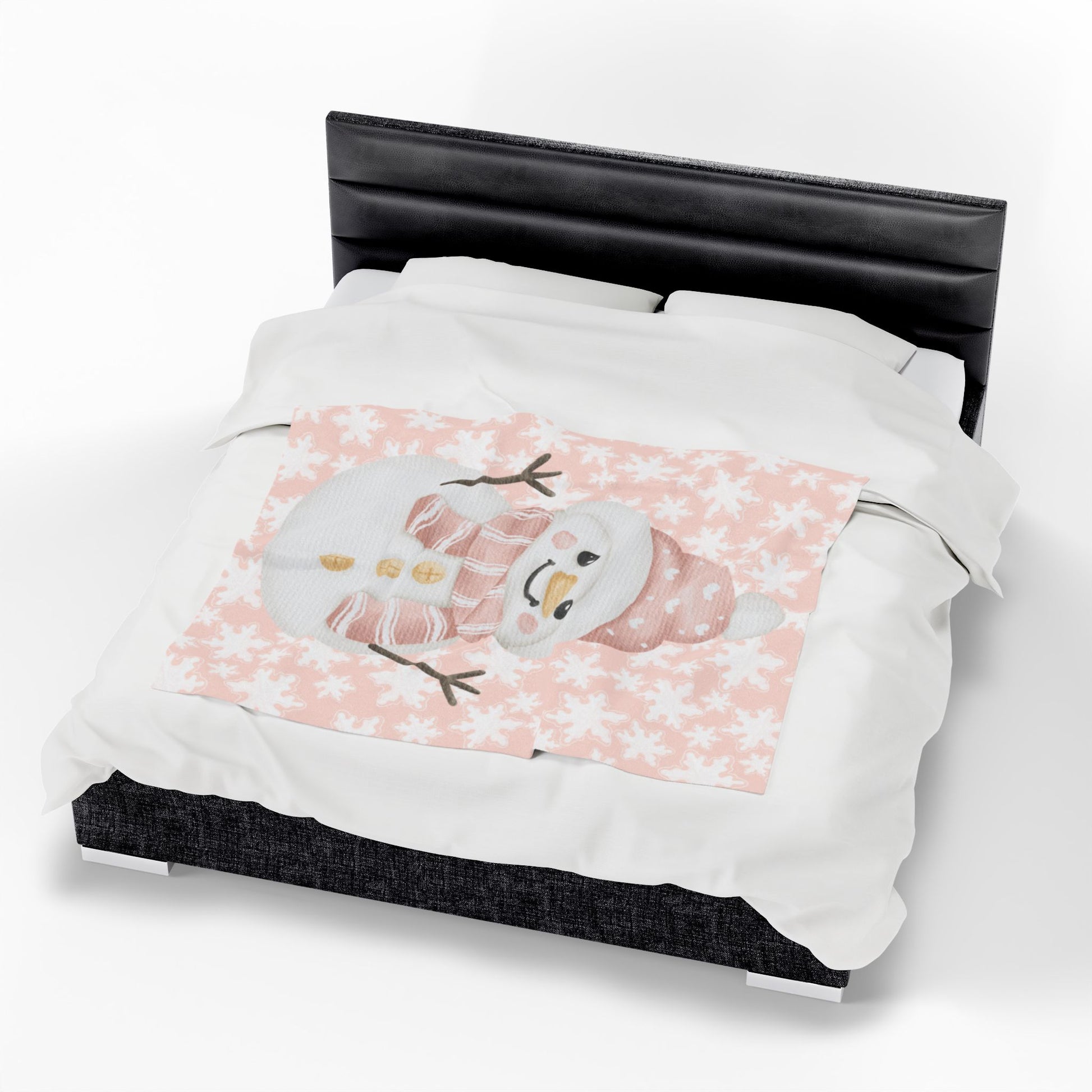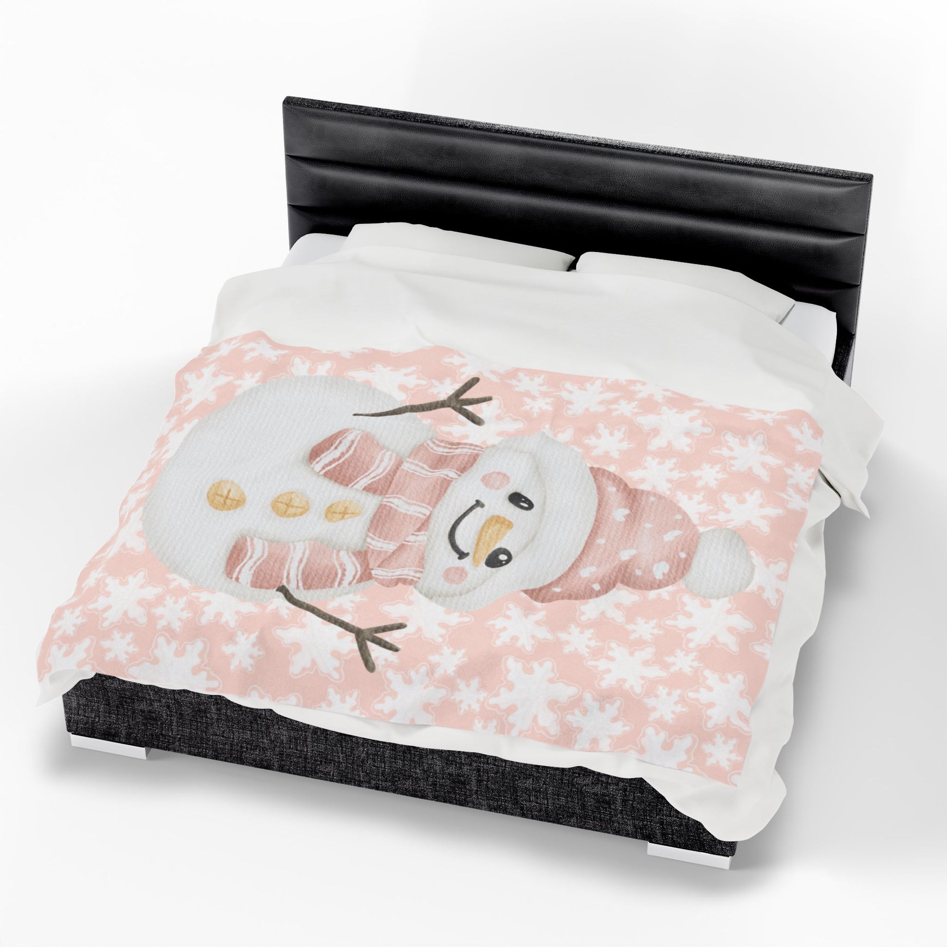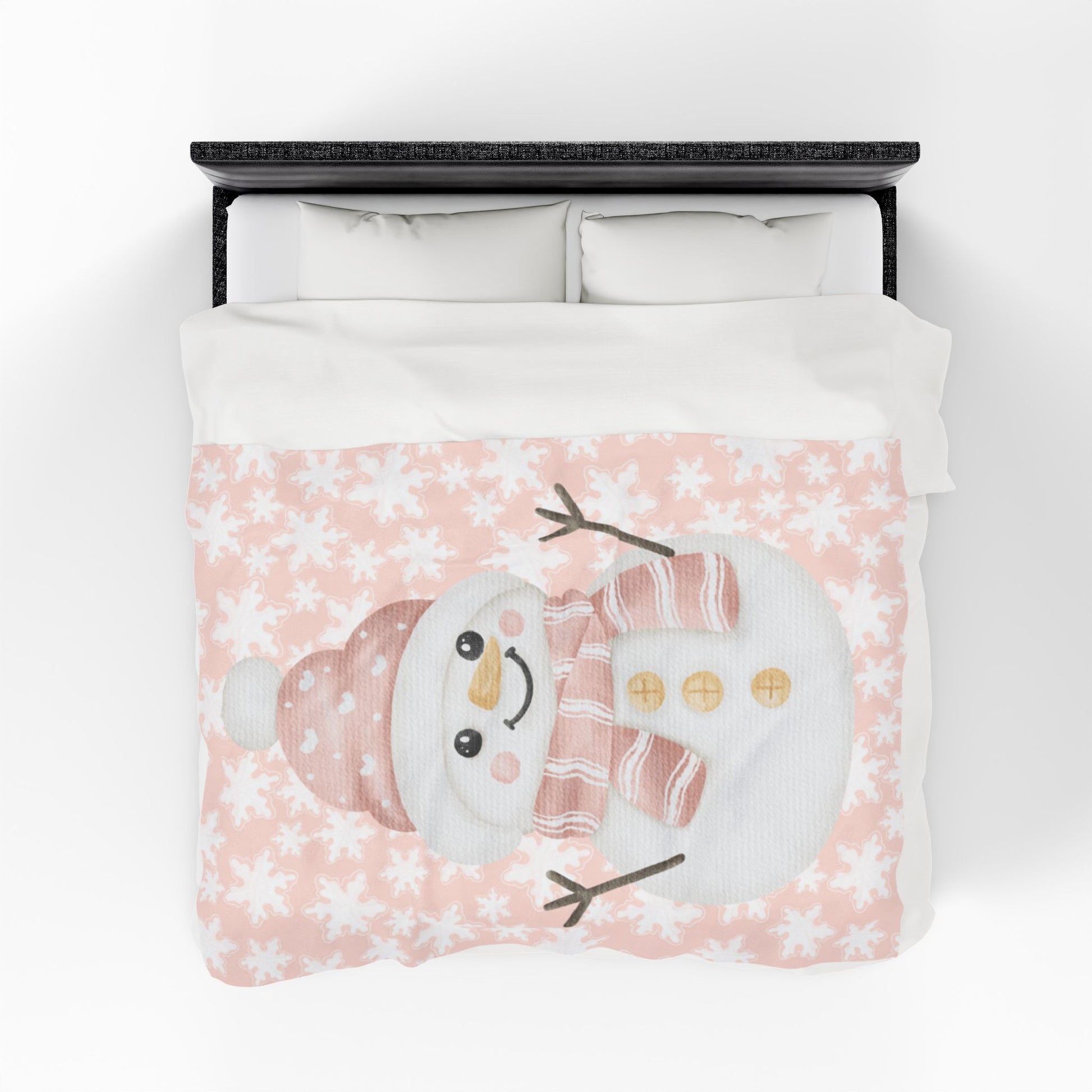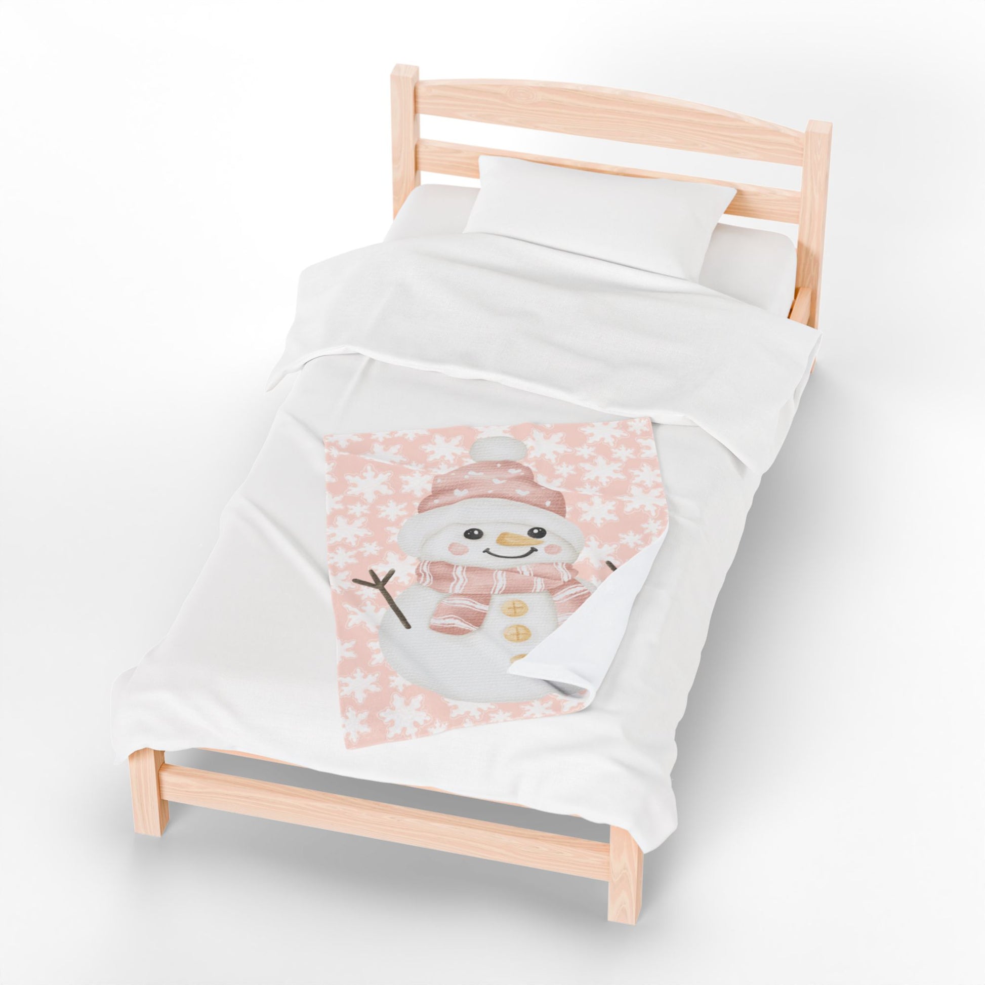 A velvety plush blanket featuring a pink snowmen on a pink snowflake background, perfect for kids during the winter season. This cozy throw makes a great holiday gift and adds a festive touch to any room.