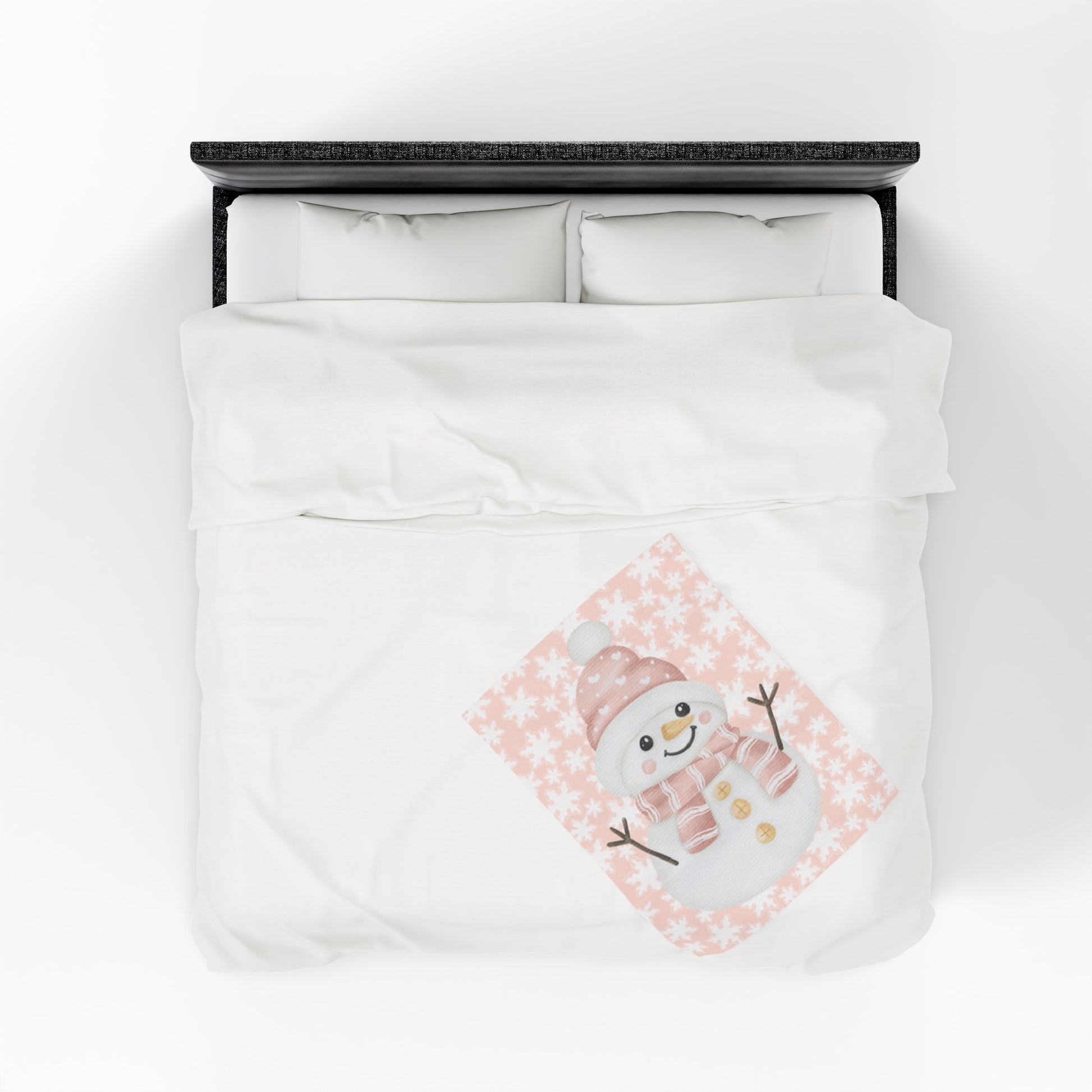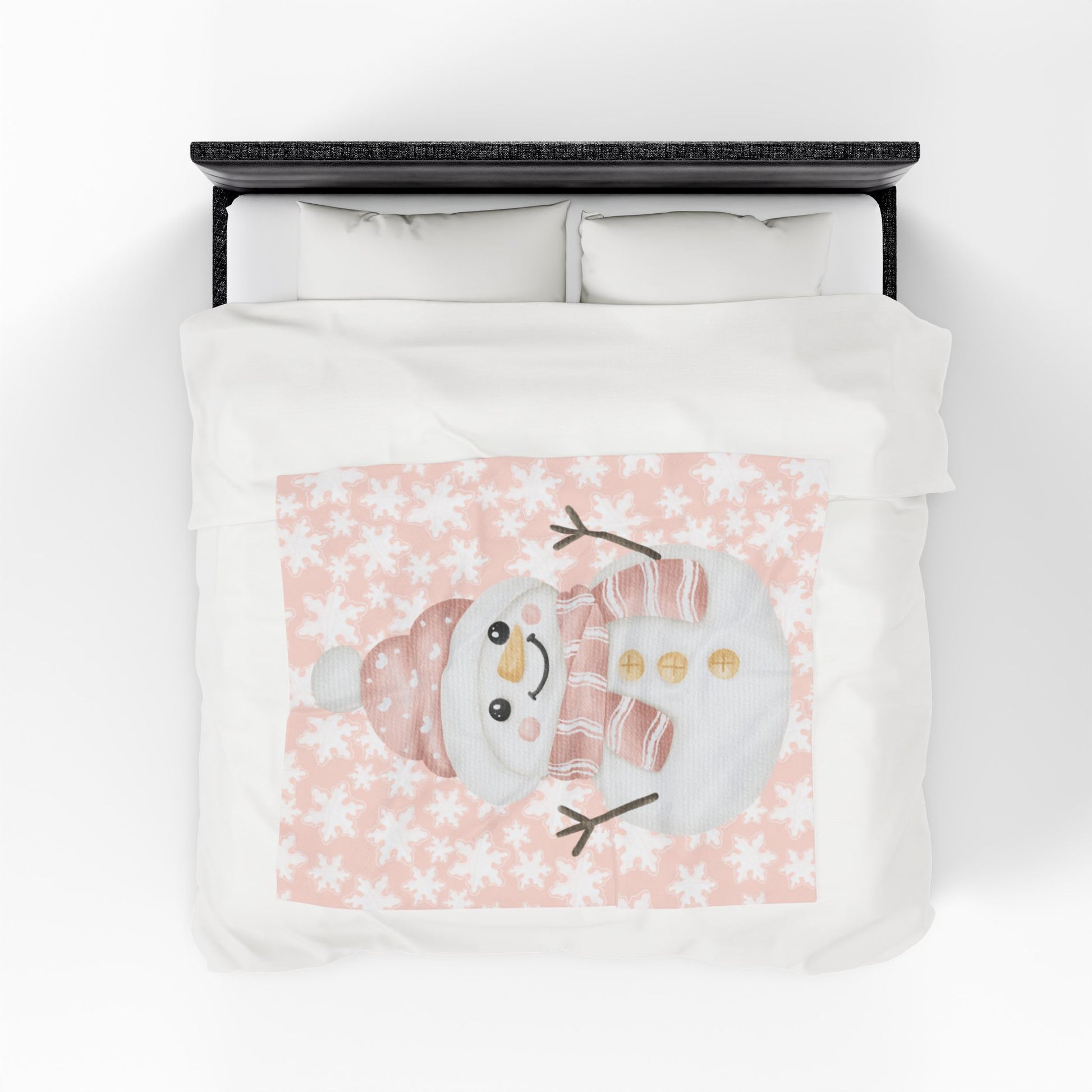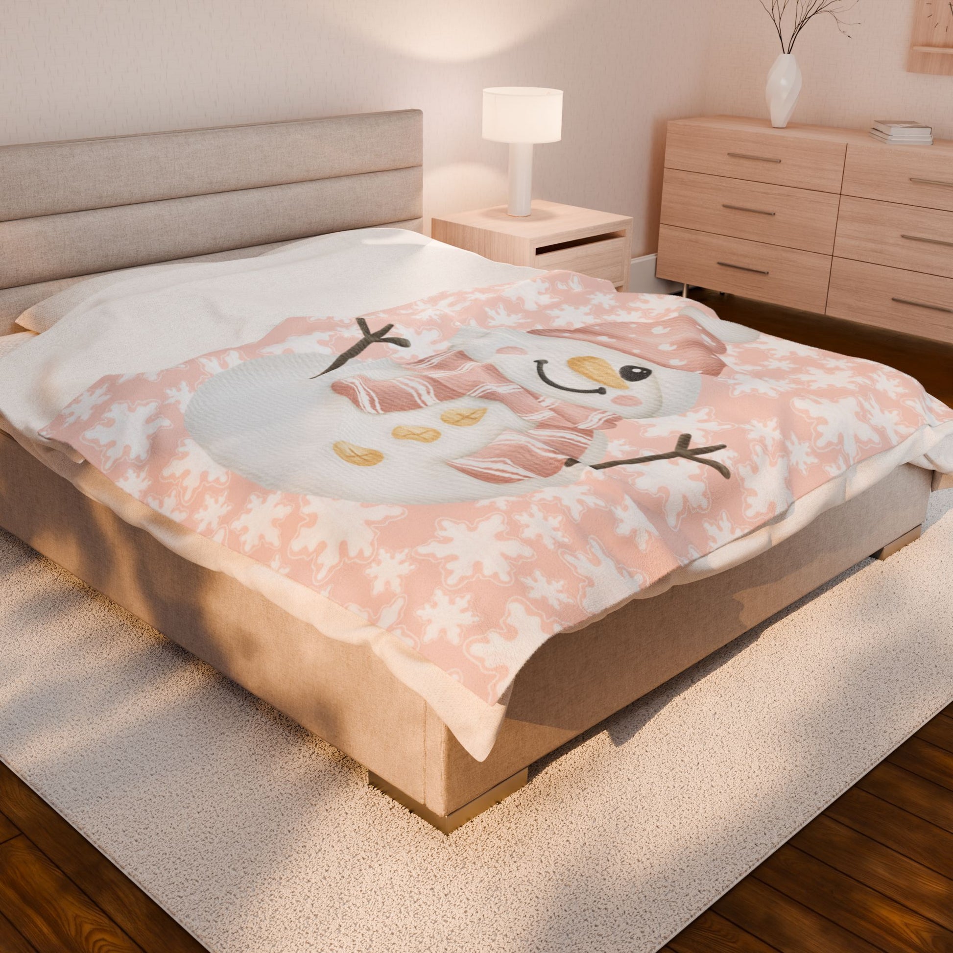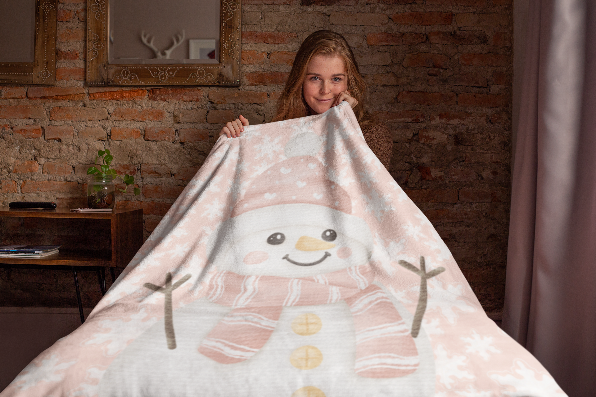 A velvety plush blanket featuring a pink snowmen on a pink snowflake background, perfect for kids during the winter season. This cozy throw makes a great holiday gift and adds a festive touch to any room.