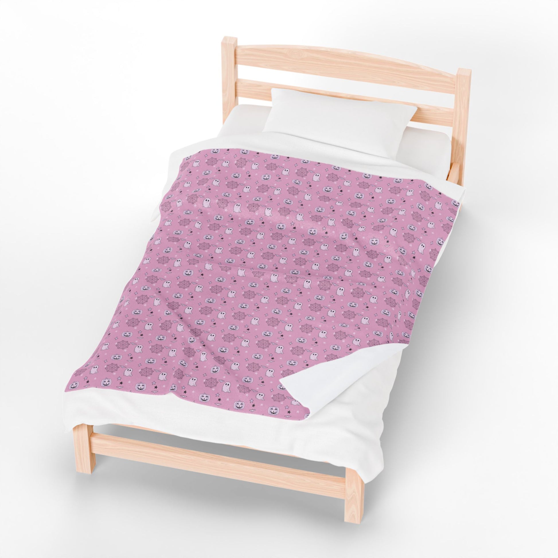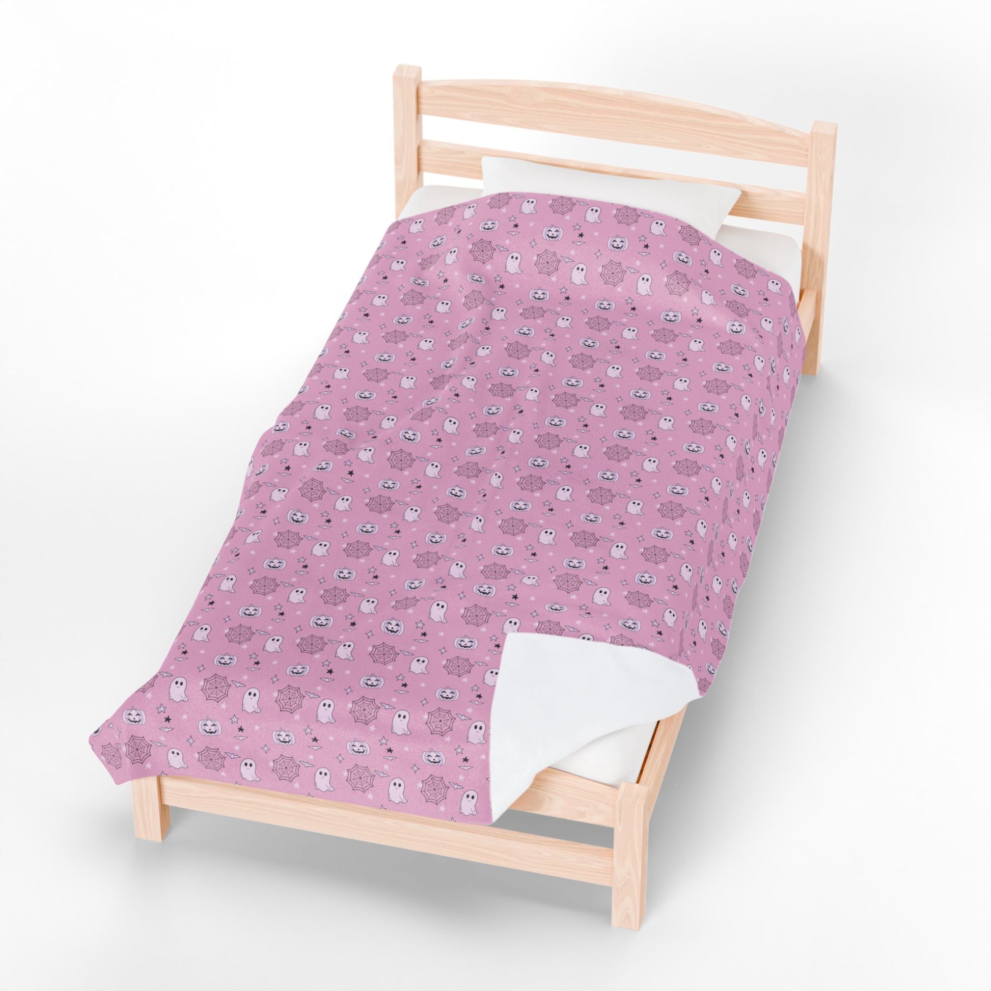 Pink Halloween Plush Blanket – Ghost, Pumpkin & Spider Web Cozy Throw for Fall, Spooky Season Decor & Halloween Gift