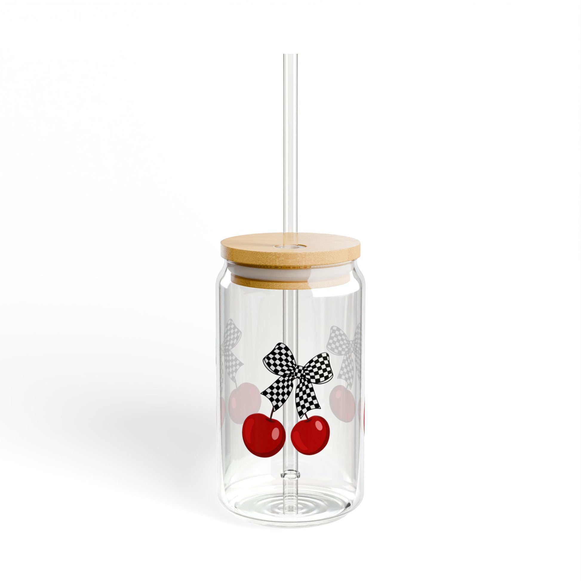 Gingham Cherry Sipper Glass | 16oz Drinking Jar with Straw, Cute Checkered Kitchen Decor, Summer Party Drinkware