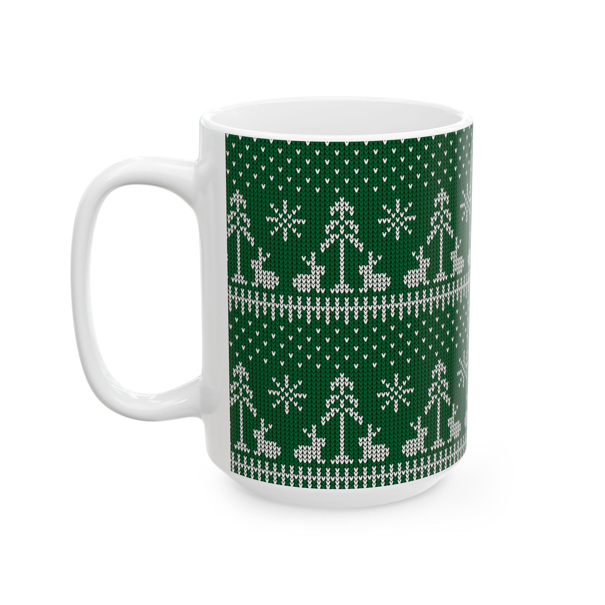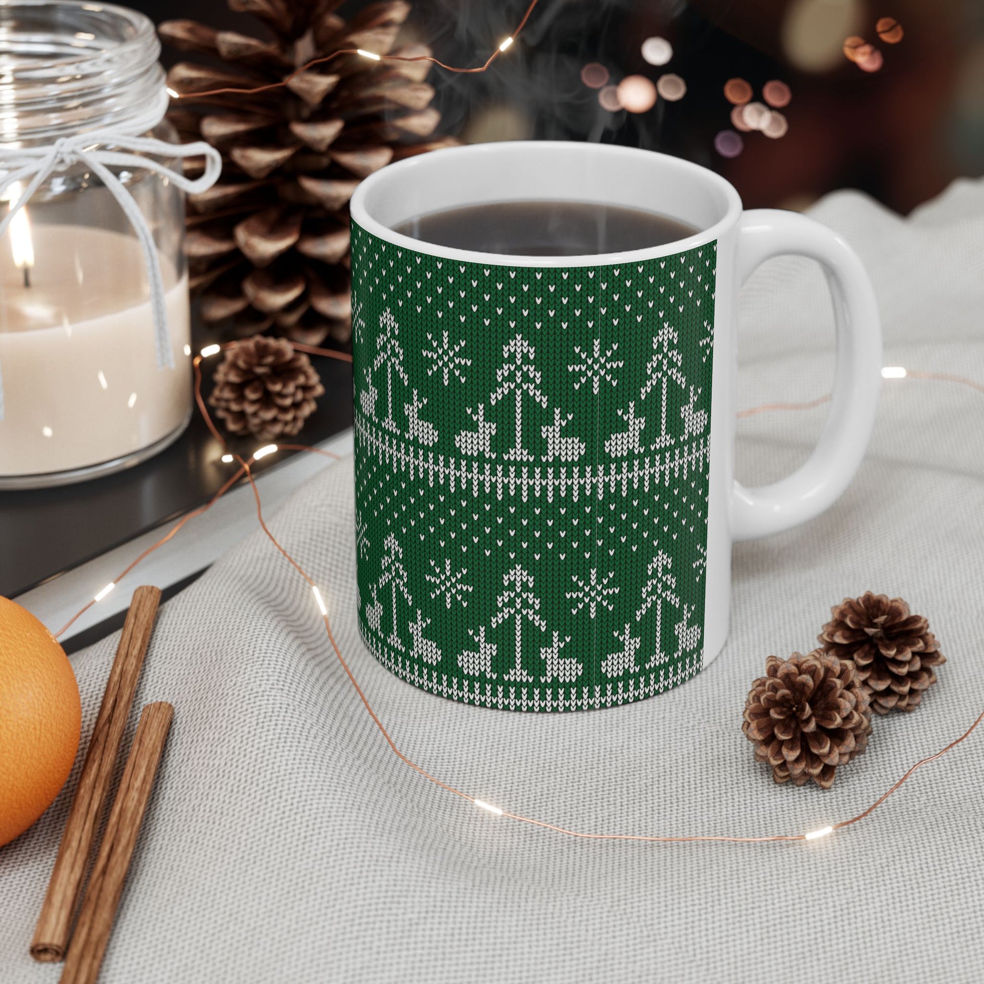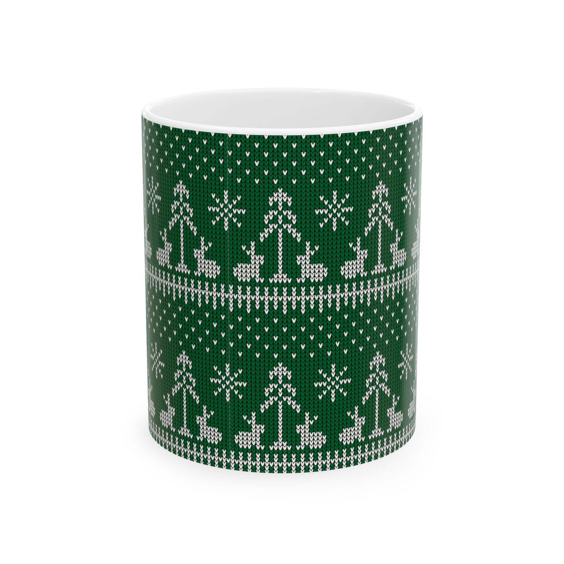 Cozy up with a touch of winter whimsy! This holiday mug features a cheerful knit-pattern design with snowflakes, pine trees, and adorable bunnies hopping through a snowy forest. It looks like your favorite holiday sweater — but better (and dishwasher safe 😉).