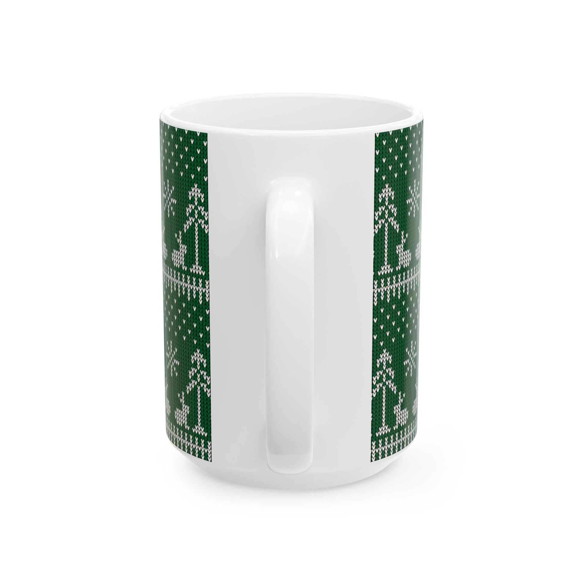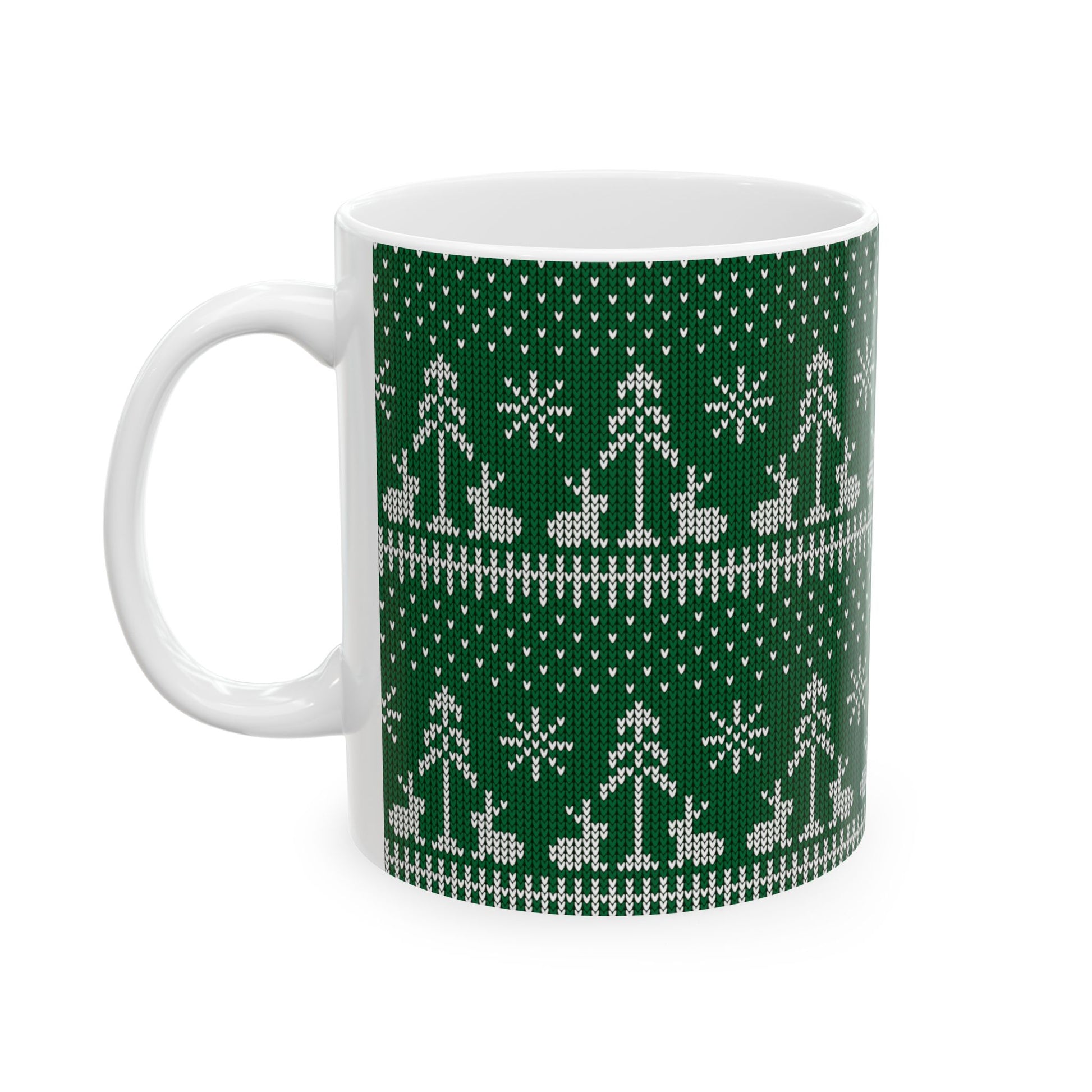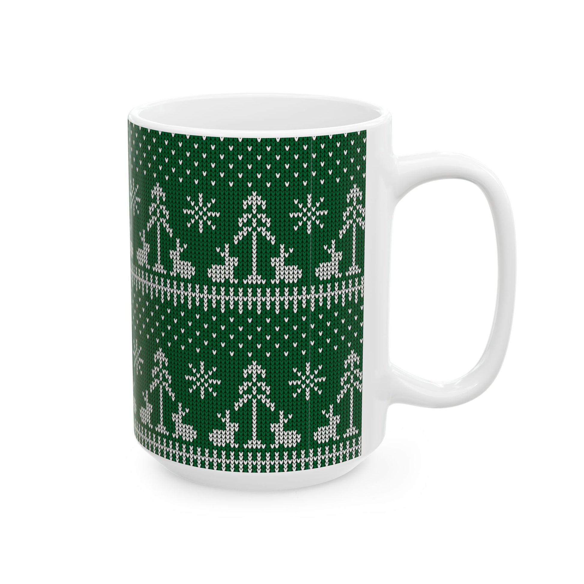 Cozy up with a touch of winter whimsy! This holiday mug features a cheerful knit-pattern design with snowflakes, pine trees, and adorable bunnies hopping through a snowy forest. It looks like your favorite holiday sweater — but better (and dishwasher safe 😉).