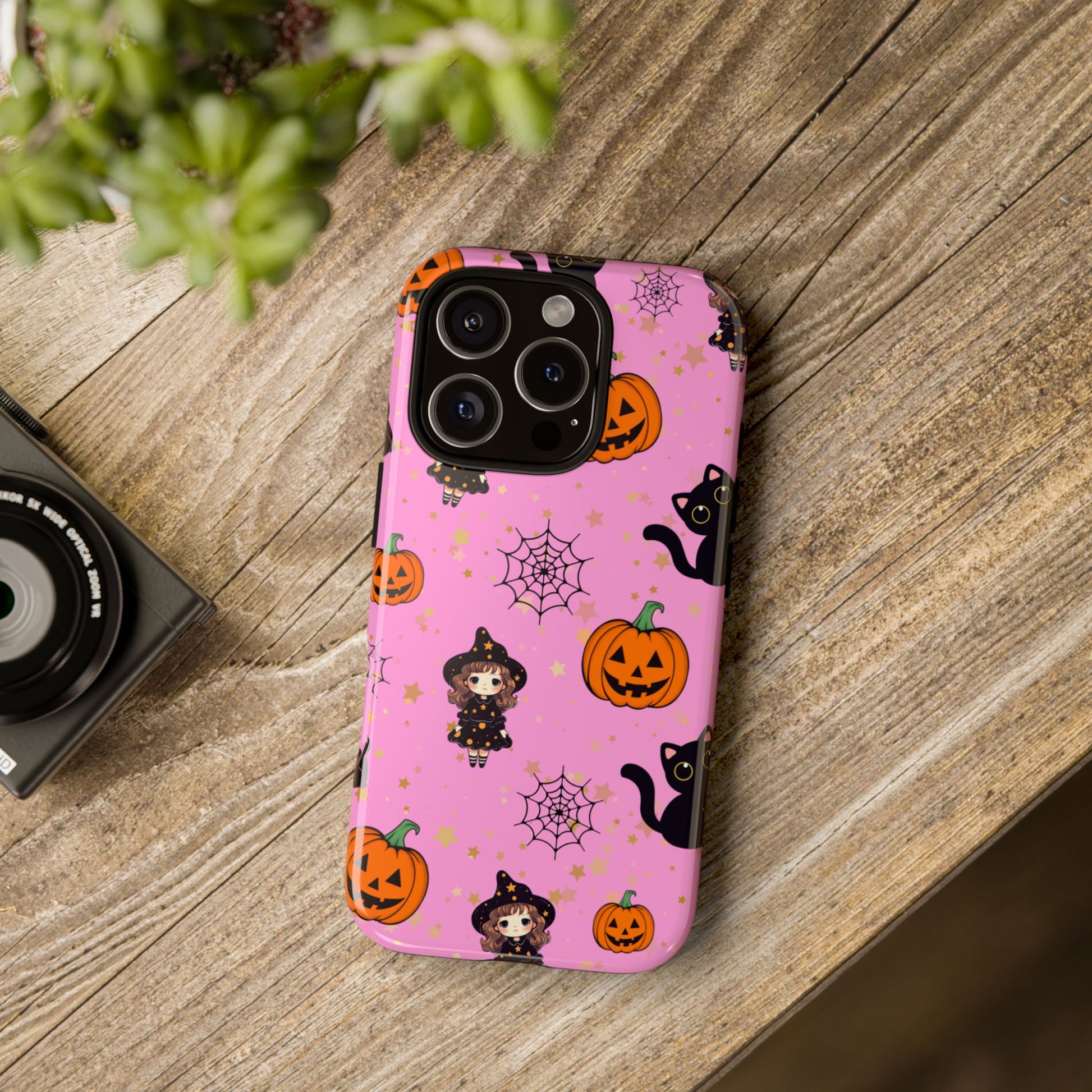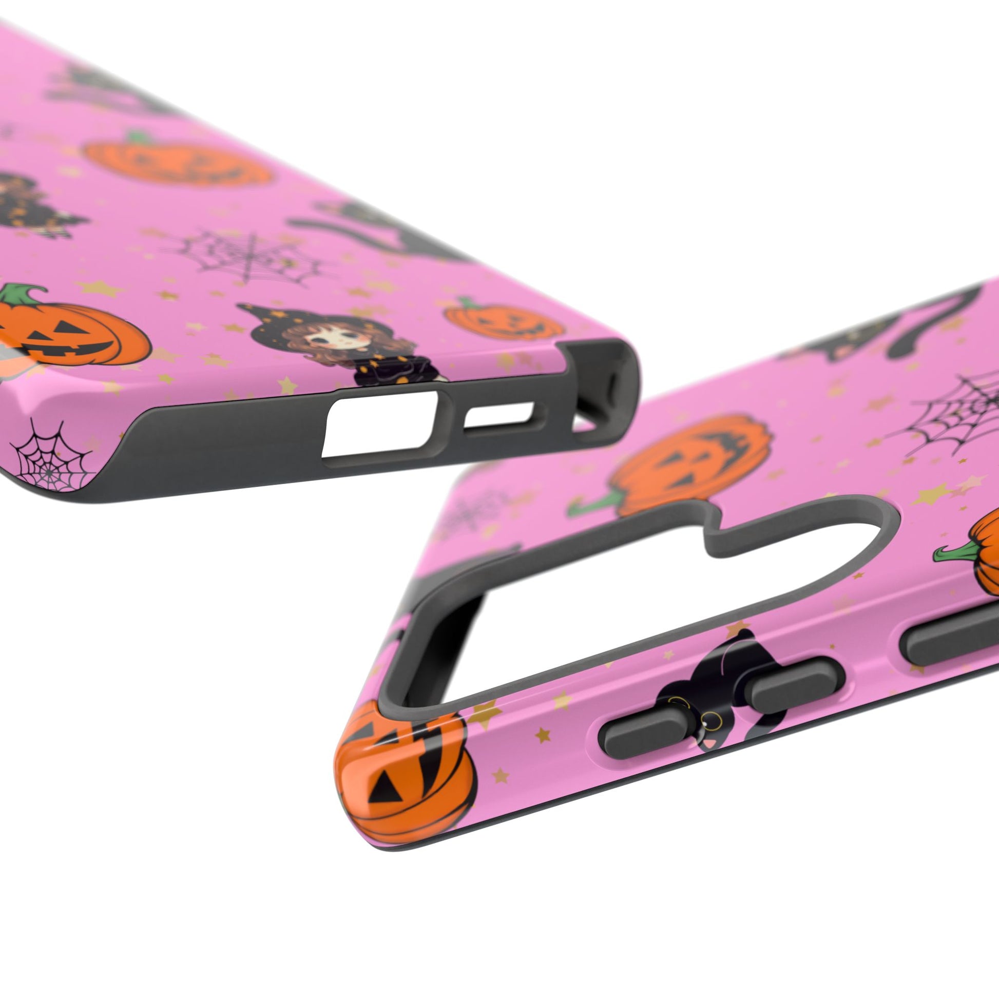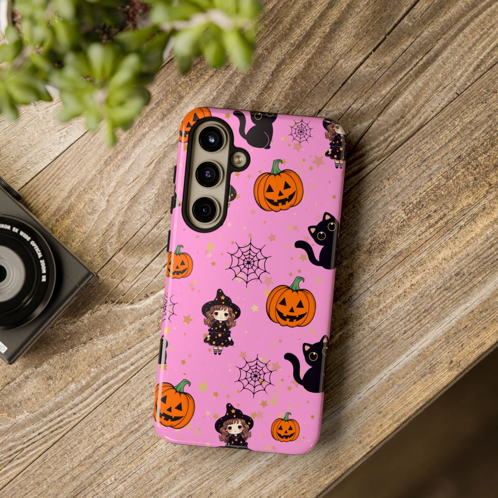 Pink Halloween Phone Case, Cute Witch and Cat Design, Spooky Fall Decor, Perfect Halloween Gift, Cute Cell Phone Case, Fun Pumpkin Design