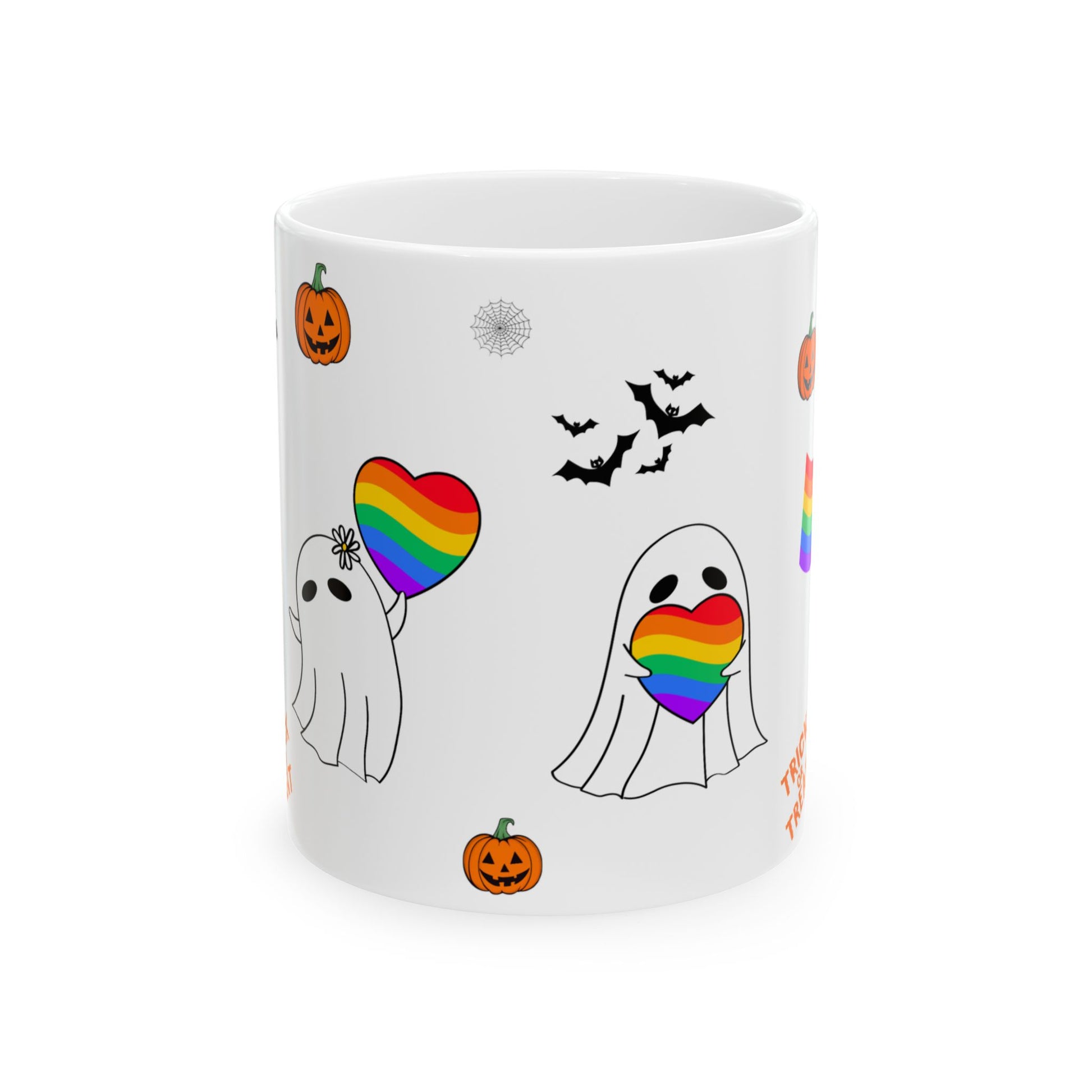 Pride Halloween Ghost Ceramic Mug, LGBTQ Coffee Mug, Rainbow Pride Tea Mug, 11oz, 15oz