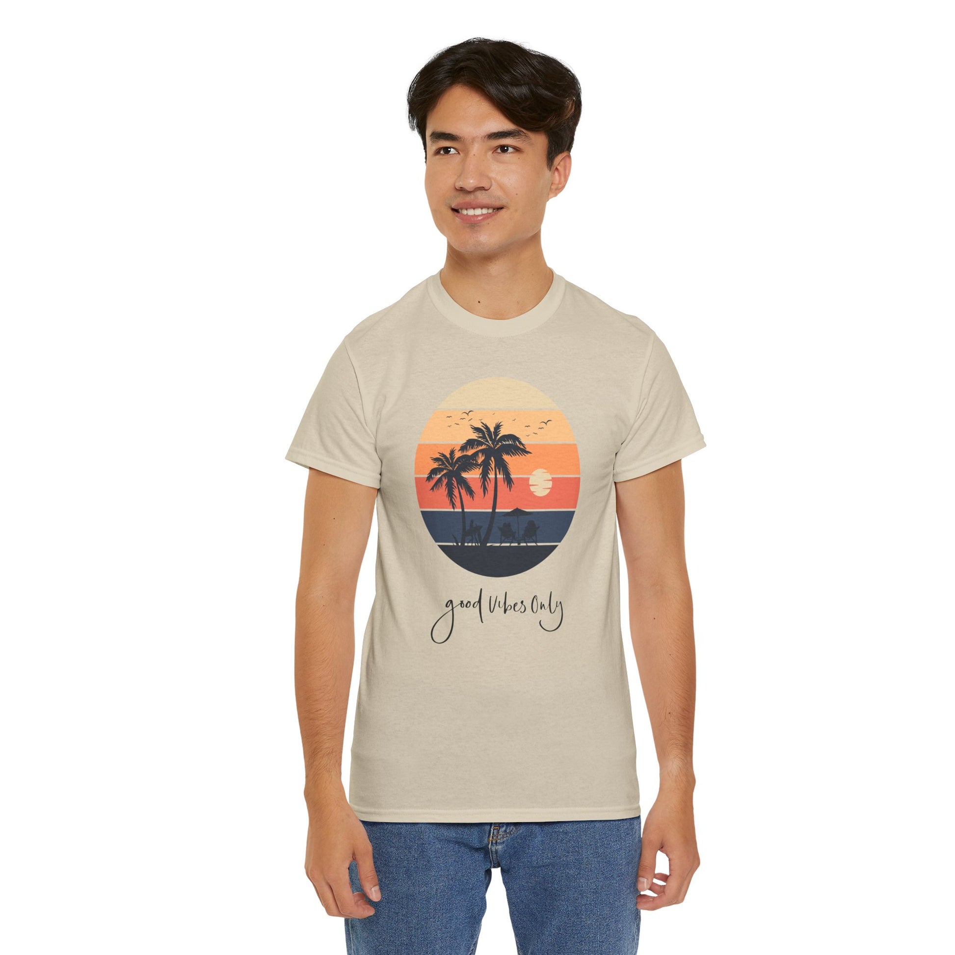 T-Shirt with Sunset Palm Graphic, Good Vibes Only Tee, Relaxed Style, Beachwear Inspiration, Summer Outfits, Vacation Casual